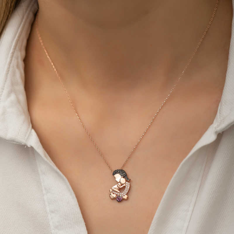 Çocuk ve anne arasındaki sevgiyi temsil eden özel bir tasarımdır. Annenize olan bağlılığınızı belirtmek için alabileceğiniz en uygun hediyelerden biri bu anne ve bebek kolyesi olacaktır. Anneniz için tasarlanan bu özel tasarım kalpli anne çocuk kolyesi 925 ayar gümüşten imal edilmiştir. Gümüş üzerine rose kaplama yapılmıştır. Rose kaplama yapılan gümüş anne çocuk kolye modelleri parlaklığını uzun süre muhafaza eder ve oksitlenmesi gecikir. Kolye üzerinde bulunan taşlar zirkondur. Gümüş olan zincir boyu ortalama 45 cm’dir. Gümüş kalpli anne çocuk kolyesi el emeği ile üretilmiştir. Gümüş ve değerli taşlar nedeniyle belirtilen ortalama ürün ağırlığında ± %10 sapma olabilmektedir.