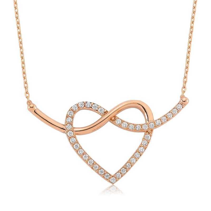 Sevdiğinize olan bağlılığınızı anlatan sonsuzluk kalp bayan kolye sonsuza kadar bitmeyecek bir aşkı sembolize eder. Kalbinizin her zaman sevdiğiniz kişide olduğunu ifade eden bu kolye hayatınızın aşkına alabileceğiniz en anlamlı hediyelerden biri olacaktır. Bu özel tasarım bayan kolye modeli 925 ayar gümüşten imal edilmiştir. Gümüş üzerine rose altın kaplama yapılmıştır. Rose kaplama yapılan gümüş bayan kolye modelleri parlaklığını uzun süre muhafaza eder ve oksitlenmesi gecikir. Kolye üzerinde bulunan beyaz taşlar zirkondur. Gümüş olan zincir boyu ortalama 45 cm’dir. Gümüş sonsuzluk kalp bayan kolye diğer tüm gümüş bayan kolye modellerinde olduğu gibi el emeği ile üretilmiştir. Gümüş ve değerli taşlar nedeniyle belirtilen ürün ağırlığında ± %10 sapma olabilmektedir.