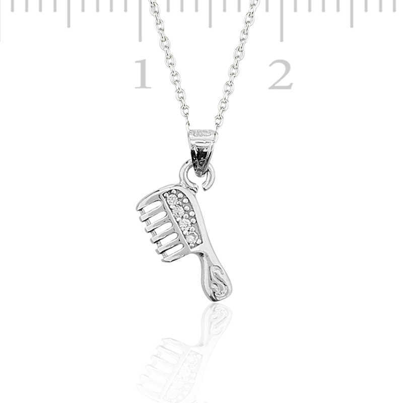 Bayan tarağı desenli bu şık tasarım kolye modeli 925 ayar gümüşten imal edilmiştir. Zirkon taşlar kullanılarak süslenmiştir. Gümüş tarak bayan kolye üzerine rodyum kaplama yapılmıştır. Rodyum kaplama yapılan gümüş bayan kolye modelleri parlaklığını uzun süre muhafaza eder, oksitlenmesi gecikir. Kolye ile birlikte gelecek gümüş zincir boyu ortalama 45 cm’dir. Tüm gümüş kolye modellerimizde olduğu gibi gümüş tarak bayan kolye modelimiz de el emeği ile üretilmiştir. Gümüş ve değerli taşlar nedeniyle belirtilen ürün ağırlığında ± %10 sapma olabilmektedir.